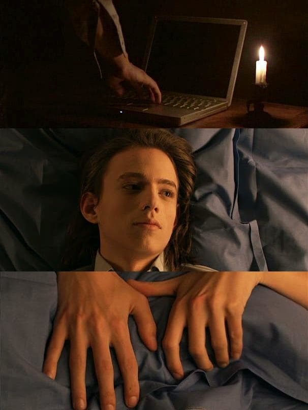 Virgile and Blanche, both aged 17, correspond by e-mail. Virgile loves Blanche, but Blanche loves a boy named Eustache. Nobody knows the other’s thoughts. Virgile talks about life and death and Blanche listens acceptingly. Eustache enters the room in a blue cap. He sees Virgile first, then Blanche. Then Blanche remembers having danced with Virgile and leves the room to join him.