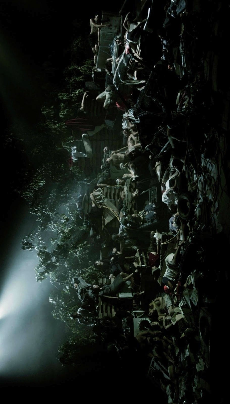 We see the site of an unknown disaster, the debris of history that constitutes the story of Earth. Upon the site, lay fifty 50 humans oscillating between consciousness and unconsciousness, life and death. Sometimes, one of them emerges into the foreground – clutching a fist, batting an eyelid, or weeping for his neighbor. At other times, these figures recede from the light, losing their individual shapes to form a gigantic organism, breathing in unison, pulsating like a jellyfish, though their journey across Earth. (Ho Tzu Nyen)