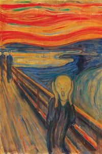 “I was walking along a path with two friends – the sun was setting – suddenly the sky turned blood red – I paused, feeling exhausted, and leaned on the fence – there was blood and tongues of fire above the blue-black fjord and the city – my friends walked on, and I stood there trembling with anxiety – and I sensed an infinite scream passing through nature.” Edvard Munch, 1893
